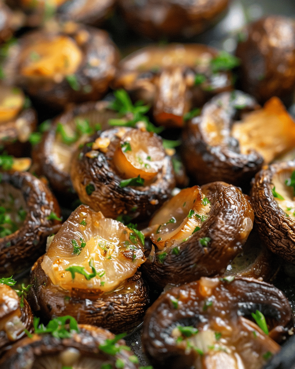 Juicy roasted mushrooms tossed in a rich garlic butter sauce, finished with herbs for a simple and flavorful side dish.