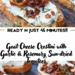 This Goat Cheese Crostini with Garlic & Rosemary Marinated Sun-Dried Tomatoes is an easy yet elegant appetizer perfect for entertaining. Creamy goat cheese is spread over crispy toasted baguette slices and topped with flavorful sun-dried tomatoes marinated in olive oil, garlic, and rosemary.