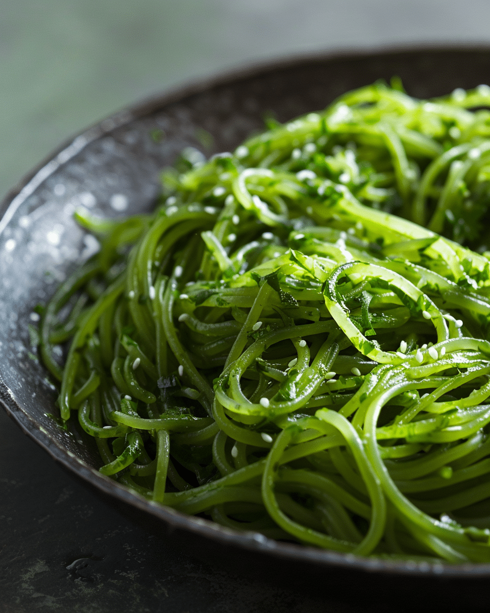 - In a large bowl, toss the cooked noodles with the green sauce until well coated.