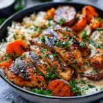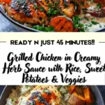 This Grilled Chicken in Creamy Herb Sauce with Rice, Sweet Potatoes & Veggies is a satisfying, versatile meal that’s perfect for weeknight dinners or meal prep. With juicy herb‑crusted chicken, a rich sauce, and flavorful sides, it’s sure to become a favorite in your recipe rotation.