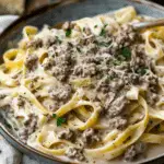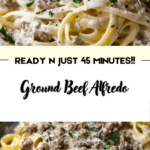 Creamy, savory ground beef alfredo combines rich homemade Alfredo sauce with seasoned beef and tender fettuccine for a comforting and satisfying weeknight dinner.