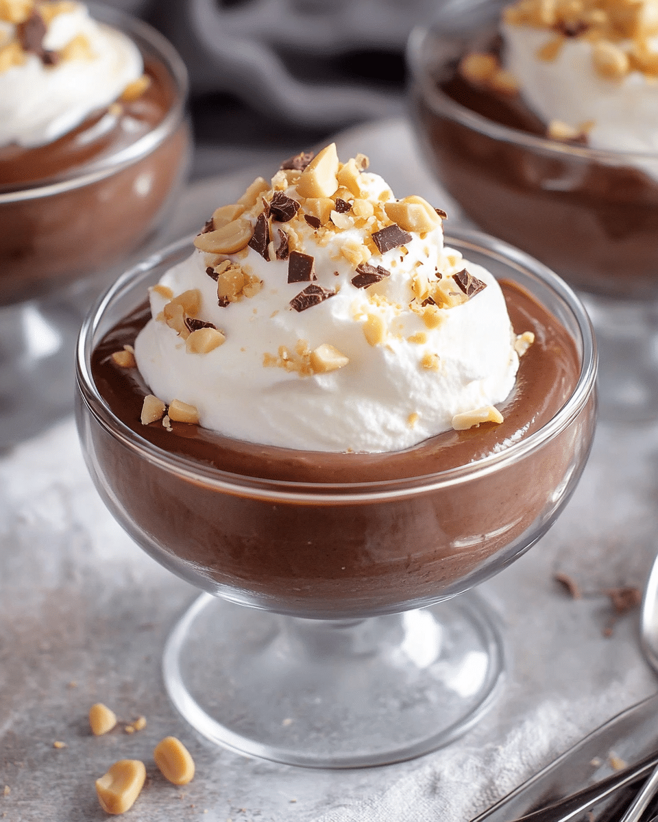 Rich, creamy no-bake chocolate peanut butter pudding combining silky melted chocolate and peanut butter with luscious whipped cream, perfect for a decadent dessert.