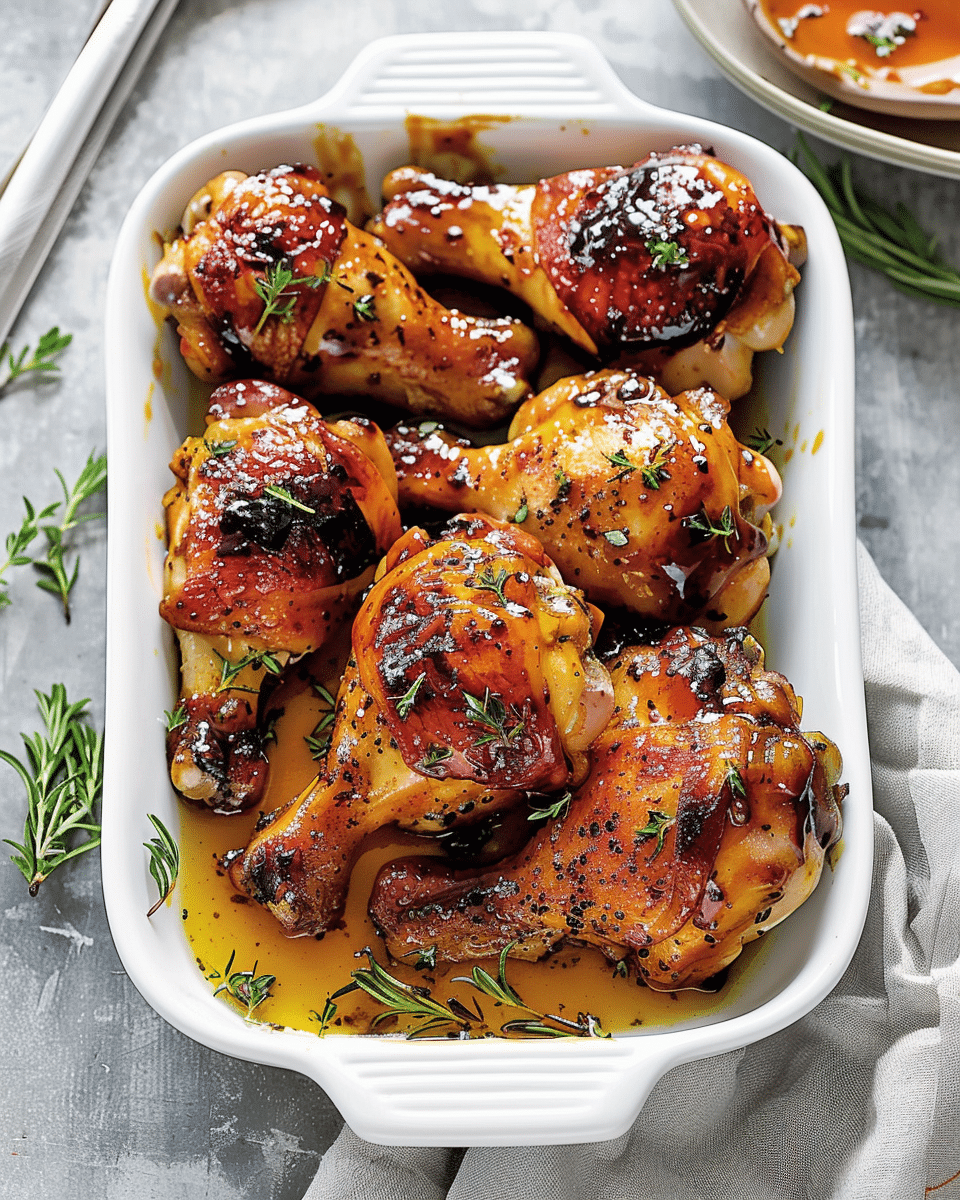 Pat the chicken skin thoroughly dry before applying the sauce. Bake uncovered, and just before the end of cooking switch on the broiler for 2–3 minutes to achieve golden, crisp skin — watch carefully to avoid burning.