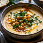 A creamy, protein-packed hummus soup made with chickpeas, tahini, garlic, and lemon, offering a comforting and flavorful dish perfect for any season.