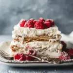 A rich and creamy no-bake icebox cake layered with chocolate graham crackers, coffee liqueur, and whipped cream, finished with toasted coconut and chocolate shavings.