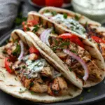 Juicy, marinated Greek chicken wrapped in warm pita with crisp vegetables, golden chips, and a creamy tangy sauce. These homemade chicken gyros are packed with bold Mediterranean flavor and perfect for sharing.
