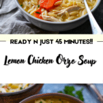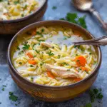 A comforting lemon chicken orzo soup with tender chicken, bright citrus flavor, and hearty vegetables in a light, flavorful broth.