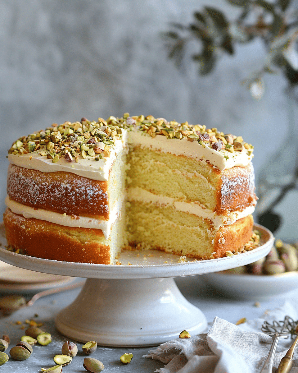 The texture is tender and moist, while the lemon zest enhances the citrus aroma throughout the cake. Pistachios bring both flavor and a subtle crunch that makes each bite interesting and satisfying.