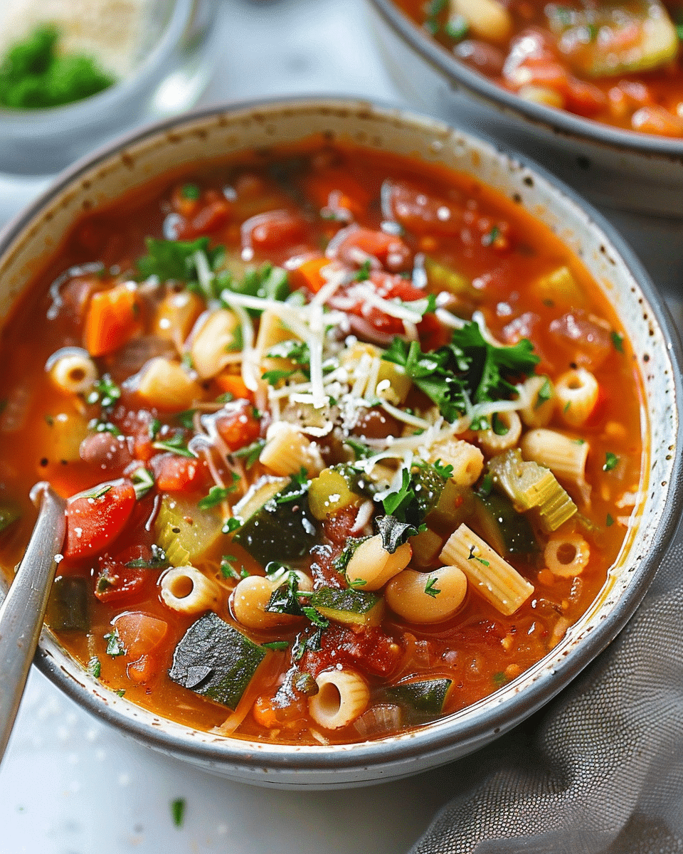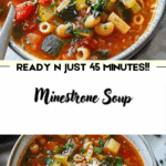 This hearty minestrone soup is packed with vegetables, beans, pasta, and flavorful herbs, making it a comforting and nourishing meal perfect for any season.