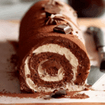 This moist and fluffy chocolate roll cake features a rich cocoa sponge rolled with a light whipped cream filling. It’s a classic dessert that’s both elegant and indulgent—perfect for special occasions or as a delightful treat with coffee or tea.