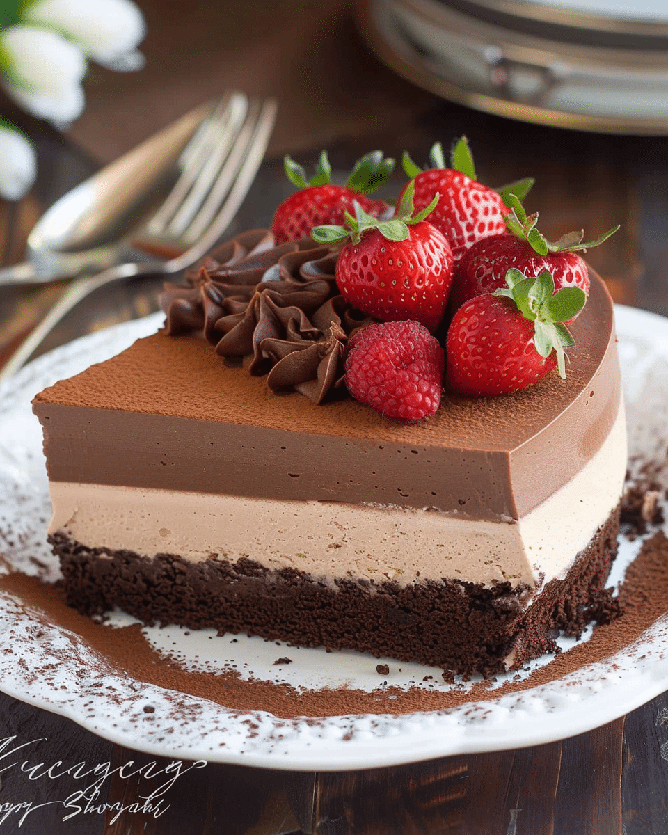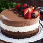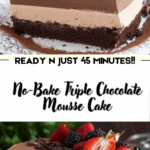 This No-Bake Triple Chocolate Mousse Cake is a dream dessert for chocolate lovers. With its silky mousse layers and crunchy Oreo base, it delivers elegance, indulgence, and simplicity all in one. Whether for a celebration or a special weekend treat, it’s guaranteed to impress — no oven required.