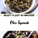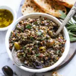 This easy olive tapenade is a bold, savory Mediterranean spread made with a blend of olives, capers, garlic, lemon juice, and olive oil. Perfect as an appetizer with crackers or bread, or as a topping for sandwiches and salads.