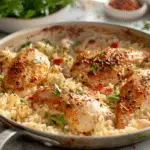 One-Pan Creamy Parmesan Chicken and Rice is the perfect combination of convenience and comfort. With tender chicken, creamy herb-infused rice, and savory Parmesan cheese, it delivers rich flavor in every bite. The one-pan cooking method makes it ideal for busy evenings while still providing a hearty homemade meal. Whether you enjoy it as written or customize it with your favorite additions, this dish is sure to become a reliable and satisfying favorite in your kitchen.