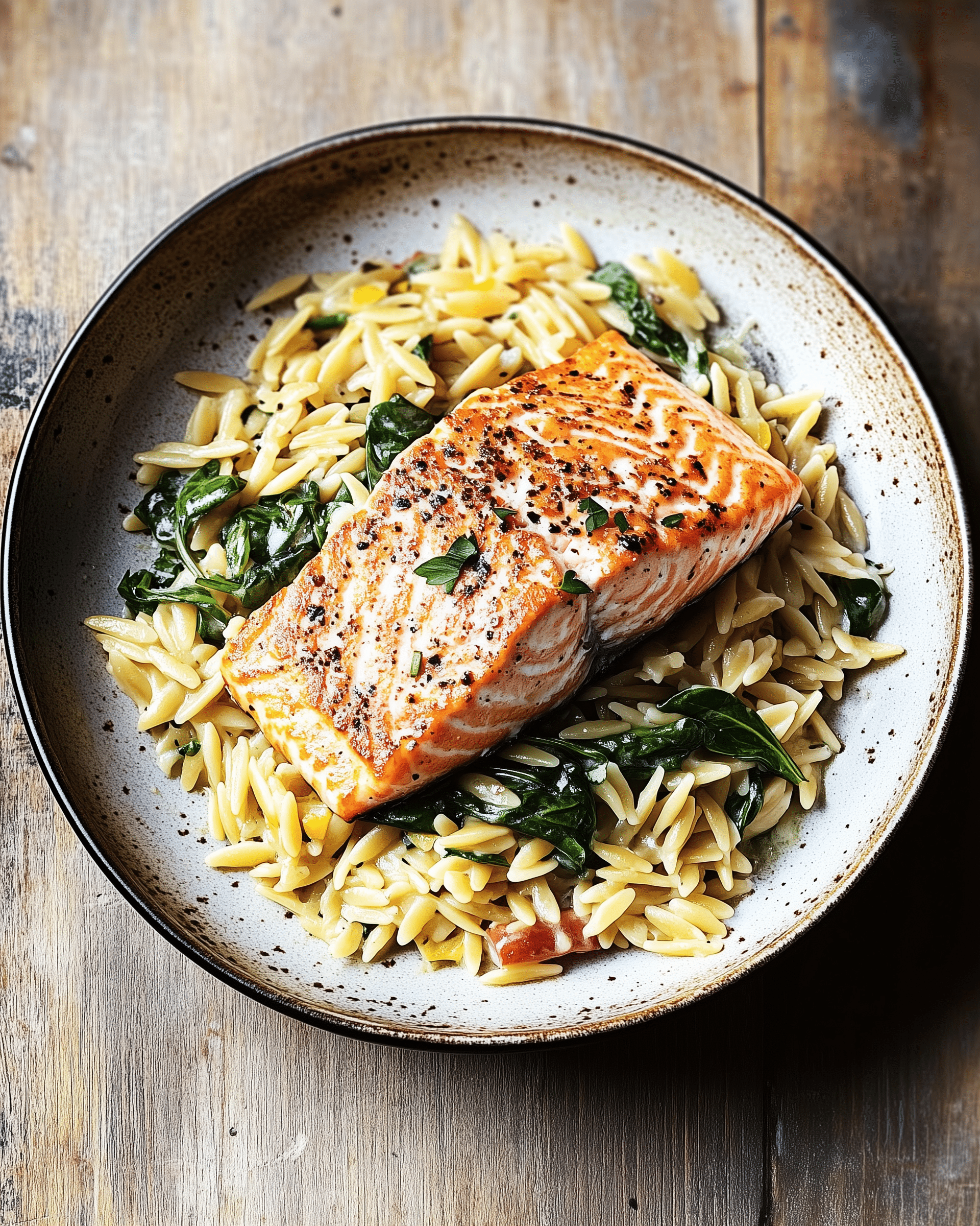 One Skillet Salmon with Lemon Orzo is a vibrant, flavorful dish that combines tender salmon with a rich, creamy orzo pasta in a zesty lemon sauce. Perfectly seared salmon fillets are paired with a savory orzo made with garlic, thyme, and spinach, all brought together in one skillet for easy cleanup and maximum flavor. The balance of bright lemon, hearty spinach, and the umami of Parmesan cheese makes this dish a comforting yet fresh meal that can be whipped up in just 30 minutes. Whether you’re cooking for yourself or for a group, this dish is bound to become a favorite.