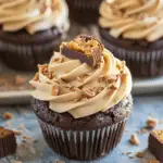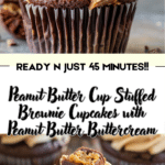 Decadent brownie cupcakes stuffed with peanut butter cups and topped with rich, creamy peanut butter buttercream. A chocolate and peanut butter lover’s dream dessert perfect for parties or special treats.