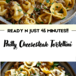 A creamy, hearty twist on the classic Philly cheesesteak, combining tender beef, peppers, and cheese-filled tortellini in a rich skillet sauce.