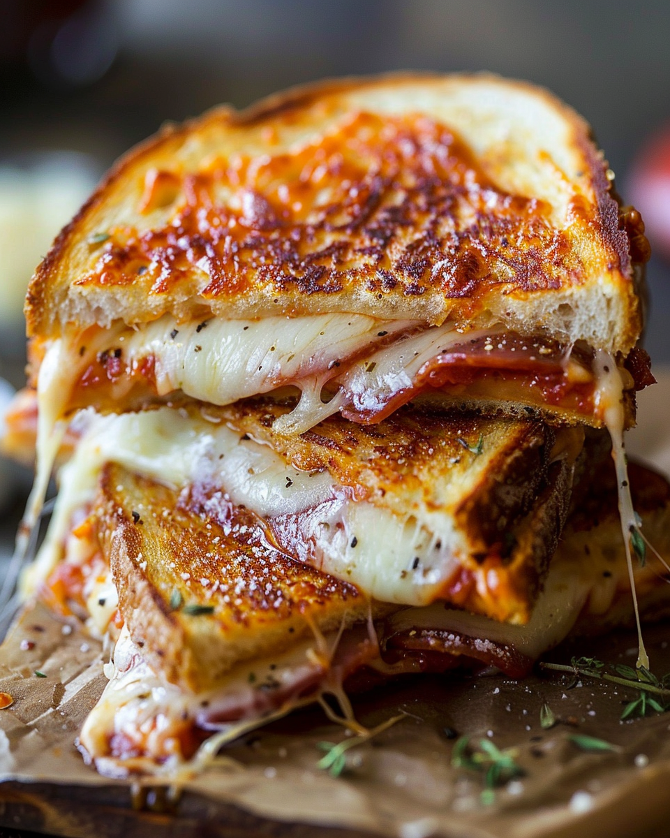 A crispy, buttery grilled cheese sandwich loaded with gooey mozzarella, rich pizza sauce, and classic Italian flavors for the ultimate pizza-inspired comfort food.