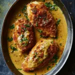 Crispy pretzel-crusted chicken breasts baked to golden perfection and topped with a creamy mustard cheddar sauce. This savory dish delivers a delicious crunch with a rich, tangy finish.