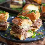 These Roast Beef Sliders are a delicious and easy-to-make party appetizer or weeknight dinner, featuring layers of roast beef, melty provolone cheese, and caramelized onions on Hawaiian rolls, all brushed with a savory buttery glaze and baked to golden perfection.