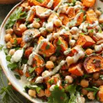 This Roasted Sweet Potato Chickpea Salad is a hearty and flavorful plant-based dish featuring spiced roasted sweet potatoes and chickpeas, tossed with fresh greens and a creamy tahini dressing. Perfect for meal prep, lunches, or a light dinner.
