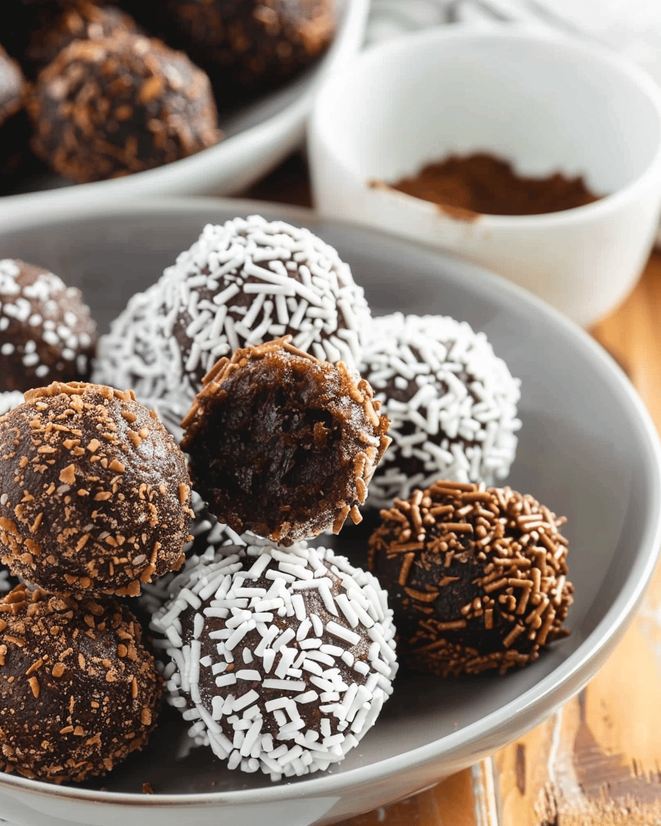 Roll in other coatings — shredded coconut, crushed cookies, or a mix of nuts‑and‑cocoa for different textures and looks.