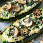 Tender zucchini boats filled with a savory mixture of mushrooms, spinach, ricotta, and herbs, baked until golden and bubbly for a wholesome and satisfying vegetarian meal.
