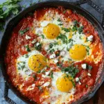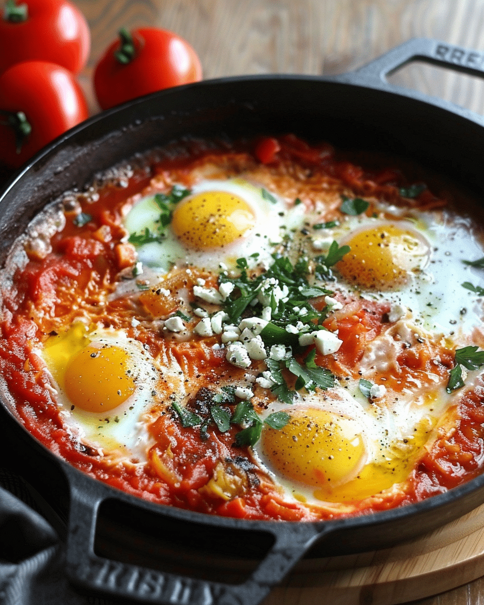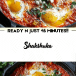 This shakshuka recipe features poached eggs in a spicy tomato and red pepper sauce, making it a comforting, hearty, and flavorful dish perfect for breakfast, brunch, or dinner.