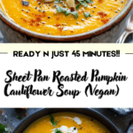 Sheet pan roasted pumpkin cauliflower soup is an easy, flavorful vegan recipe that turns simple vegetables into a creamy and comforting meal. With its rich roasted taste, smooth texture, and flexible topping options, it is a soup you can enjoy all season long. Whether you serve it for a weeknight dinner, meal prep lunch, or cozy gathering, this recipe is sure to become a favorite.