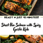 This sheet pan salmon with spicy garlic kale is a healthy, flavorful, and quick weeknight dinner that comes together in under 30 minutes. The salmon is perfectly roasted and served alongside crispy, garlicky kale with a hint of spice.
