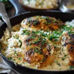 A creamy smothered chicken and rice dish made in one pan with tender chicken, fluffy rice, and a rich, velvety sauce. Perfect for a cozy family dinner or an easy weeknight meal.