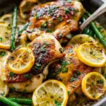 Assemble the dish: Arrange the chicken back on top of the green beans (or serve individually). Drizzle the lemon‑butter sauce over the entire skillet or onto each plate. Serve immediately.