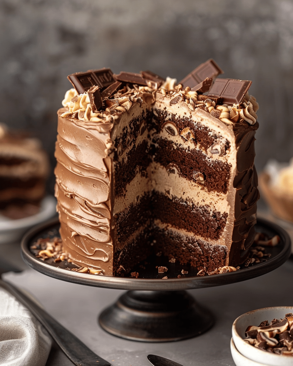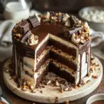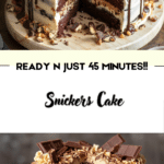 A rich and indulgent Snickers-inspired cake layered with gooey caramel, chocolate, and crunchy peanuts, then topped with creamy frosting and extra drizzle.