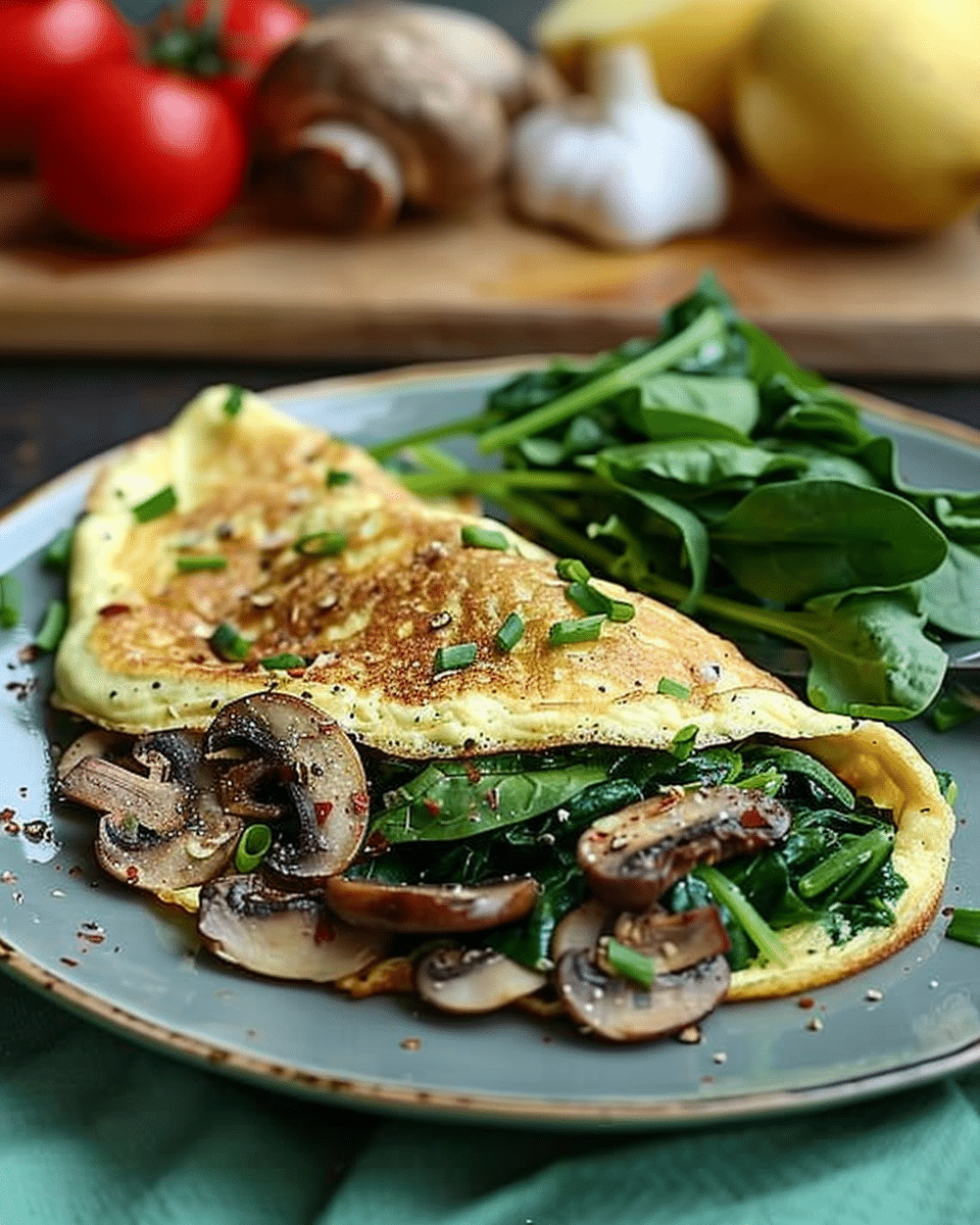 A healthy and hearty Mediterranean-style spinach and mushroom omelette, packed with vegetables and herbs for a flavorful, satisfying breakfast or brunch option.