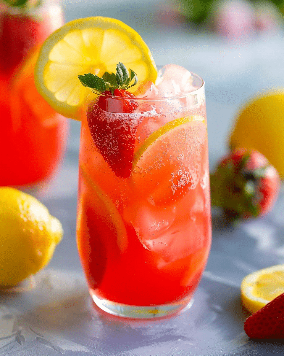 Berry blend: Replace or mix in other berries (blueberries, raspberries, blackberries) with the strawberries for a mixed‑berry lemonade.