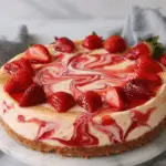 A rich and creamy cheesecake layered with a vibrant strawberry swirl, baked to perfection with a buttery graham cracker crust. This dessert is smooth, tangy, and beautifully marbled for an impressive finish.