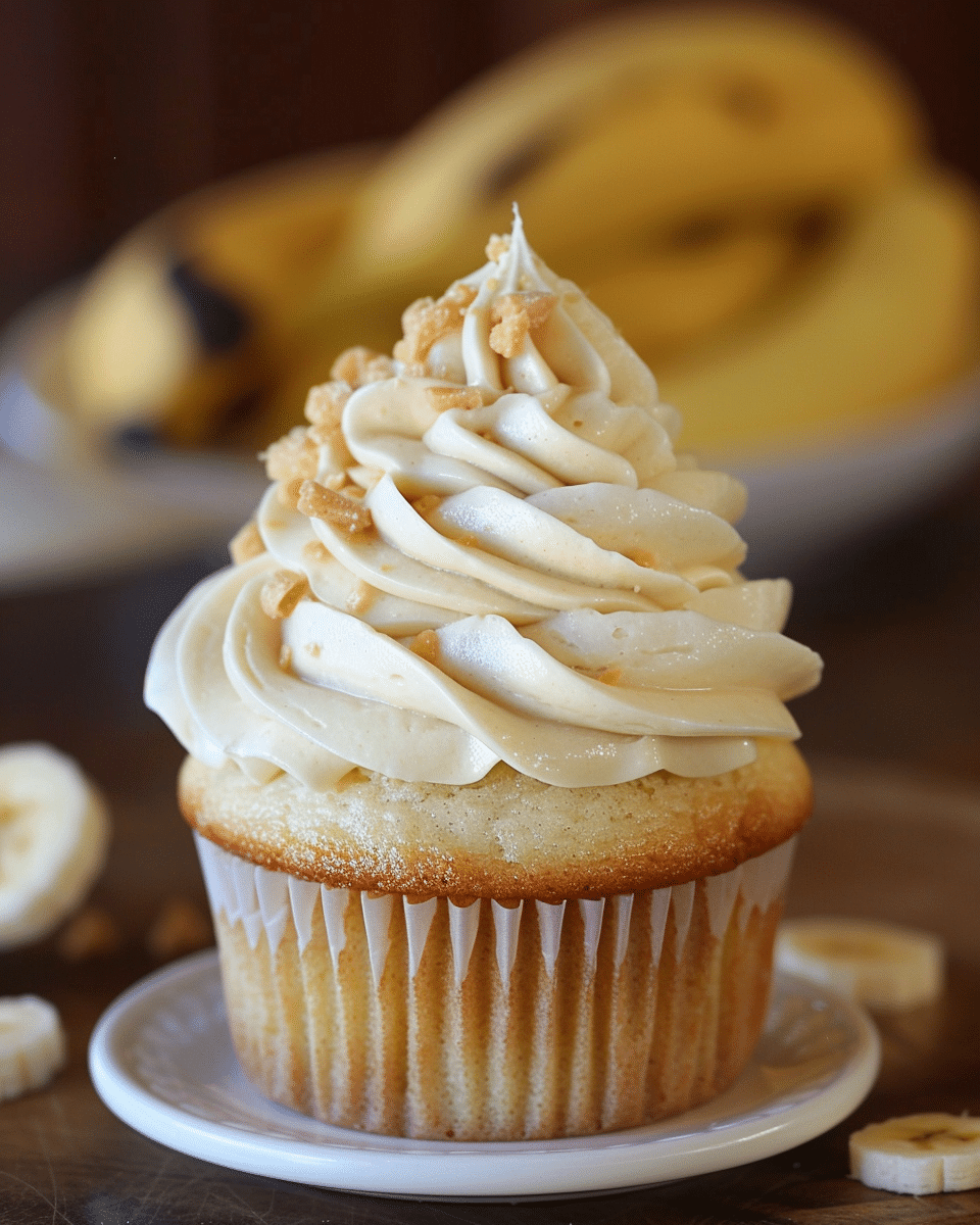 These cupcakes are incredibly moist thanks to ripe bananas and sour cream in the batter. The peanut butter Swiss meringue frosting is smooth, light, and less sweet than traditional buttercream, allowing the banana flavor to shine. The crispy savory topping and chocolate drizzle add contrast and depth, creating a memorable dessert with bold, classic-inspired flavors.