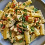 A creamy Tuscan chicken rigatoni loaded with tender chicken, garlic, sun-dried tomatoes, and spinach in a rich parmesan cream sauce.