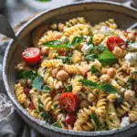 A fresh and flavorful vegan pasta salad featuring chickpeas, crisp vegetables, and tangy vegan feta tossed in a light dressing. Perfect for meal prep, picnics, or a quick healthy lunch.