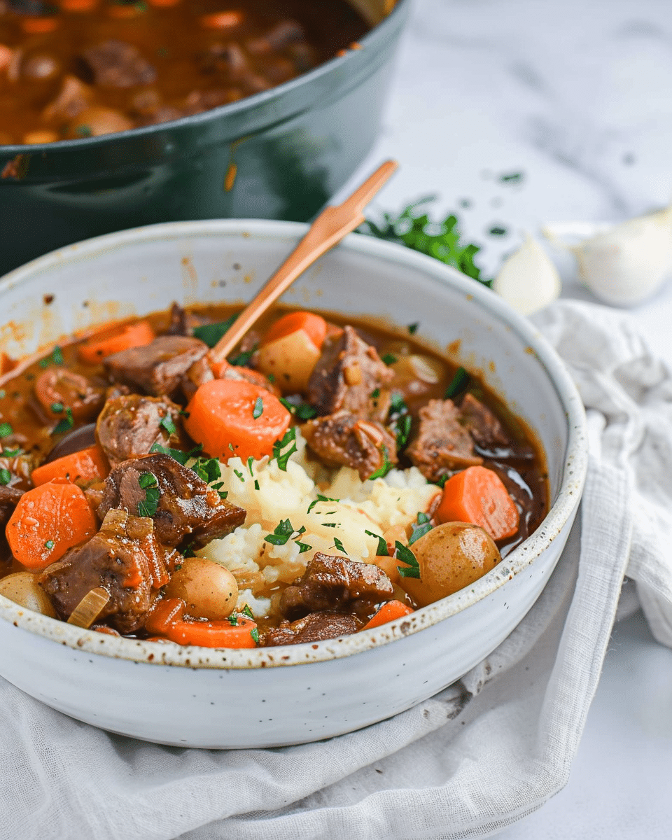 After searing the meat, you can deglaze the pot with a splash of dry red wine before adding the beef broth (if not strictly Whole30). Additionally, you can finish with a small knob of ghee or butter (if not dairy‑free) stirred in just before serving for extra sheen and richness.